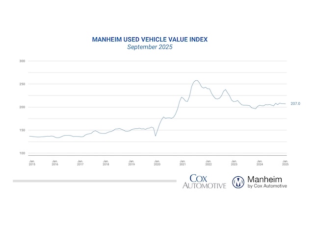 Wholesale used-vehicle prices (on a mix, mileage, and seasonally adjusted basis) were down slightly in September compared to August. The Manheim Used Vehicle Value Index (MUVVI) declined to 207.0, lower by 0.2% versus August levels but showing an increase of 2% from a year ago. The seasonal adjustment caused the index to decrease for the …