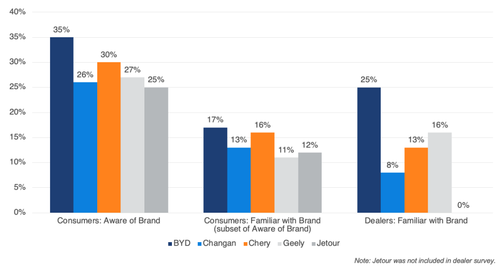 Nearly half of consumers say they are familiar with Chinese auto brands, yet that familiarity is largely superficial when asked about specific brands.