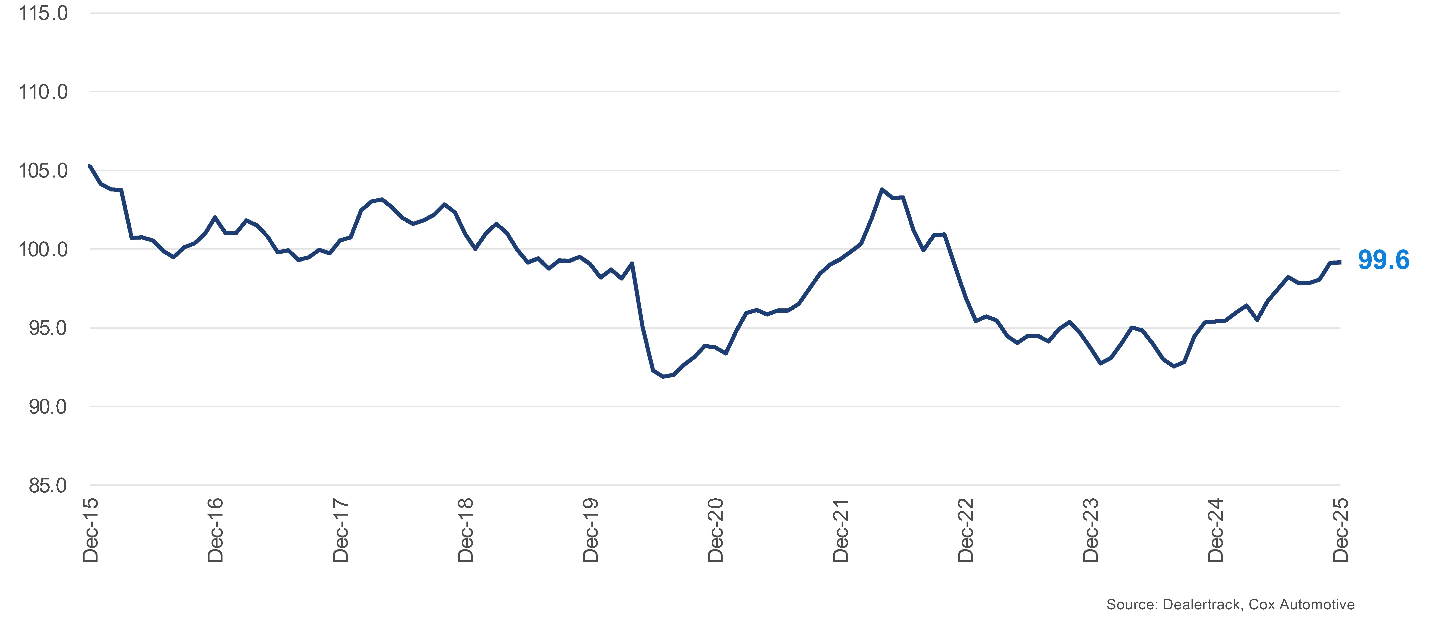 For full-year 2025, the Dealertrack Credit Availability Index averaged 97.3, a 3.4-point improvement from 2024’s average of 93.9, representing a 3.6% year-over-year gain. This marks a notable reversal from 2024, which saw the index decline slightly from 2023 levels as lenders remained cautious amid elevated rates and affordability pressures. The improvement accelerated through the year, with the second half of 2025 averaging 98.4 compared to 96.3 in the first half. December’s reading of 99.6 brought the index back near its January 2019 baseline of 100 for the first time in over two years, signaling that credit conditions have largely normalized following the tightening cycle that began in late 2022.