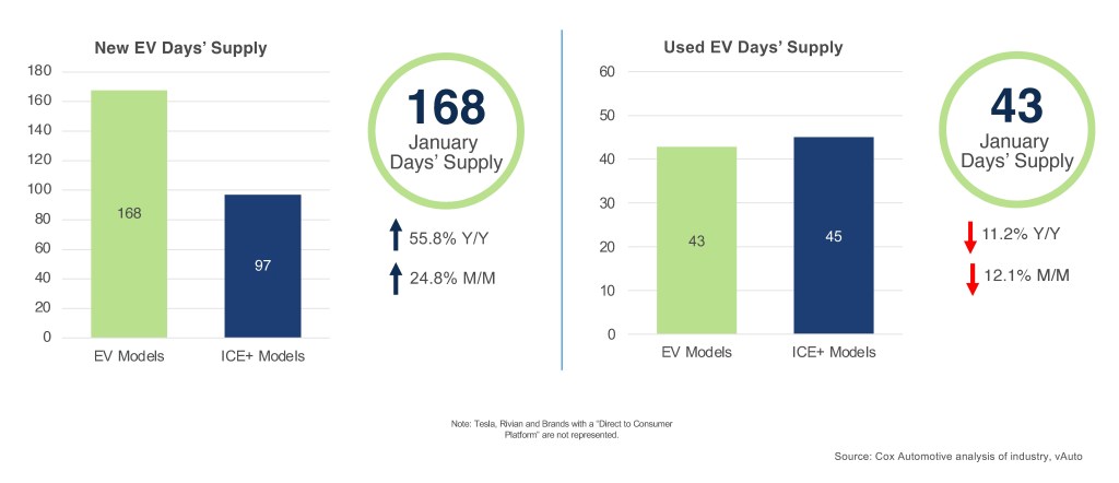 EV Days’ Supply: New EV days’ supply rose to 168 days in January, 55.8% higher than year‑earlier levels and up 24.8% month over month. The gap between EV and ICE+ days’ supply widened to 71 days, up from 59 days last month. At 168 days, new EV days’ supply is at its highest level since July 2024 and has nearly quadrupled from September’s near‑record low of 46 days. EV supply sat below ICE+ levels as recently as late October – that gap has since reversed by roughly 78 days.