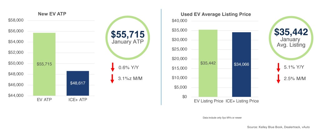 New EV ATP: The average transaction price (ATP) for new EVs in January was $55,715, down 0.6% year over year and 3.1% lower month over month. The EV premium over ICE+ narrowed to $7,098, the slimmest gap since July 2025. Incentives fell sharply from December’s record levels, averaging $6,918 or 12.4% of ATP, down from an upwardly revised 18.3% in December and below the 2025 full‑year average of 13.7%. Tesla saw its ATP decline 2.0% to $52,628, continuing to exert downward pressure on the overall EV average. Among other high‑volume brands, Mercedes-Benz (+7.9%) and Ford (+6.6%) recorded the largest month-over-month ATP increases, while Volvo (-23.5%) and Audi (-3.8%) posted the steepest declines.