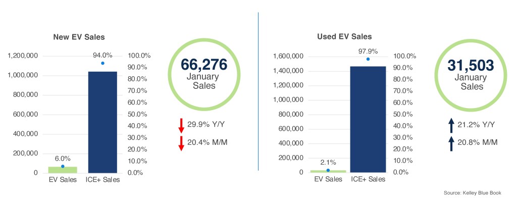 The EV Market Monitor gauges the health of the new and used electric vehicle (EV) markets by monitoring sales volume, days’ supply and average pricing. Each metric will be measured month over month and year over year. For the official quarterly report of EV data, see the Q4 Electric Vehicle Sales Report.