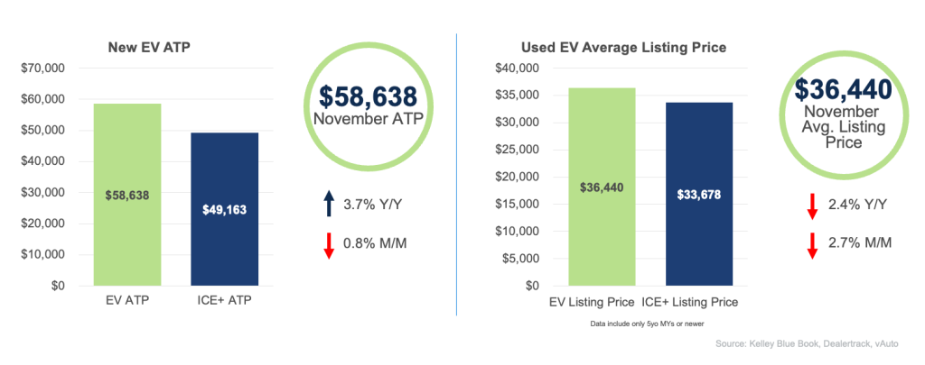 New EV ATP: In November, the average transaction price (ATP) for new electric vehicles was $58,638, up 3.7% year over year but down 0.8% from October. Incentives rebounded to $7,785, or 13.3% of ATP, up from October’s year-low of 11.1%, while the price premium over ICE+ vehicles narrowed to $9,475. Tesla’s ATP rose 1.5% month over month to $54,310, but with its dominant market share and below-market pricing, it continued to push the overall segment average downward.