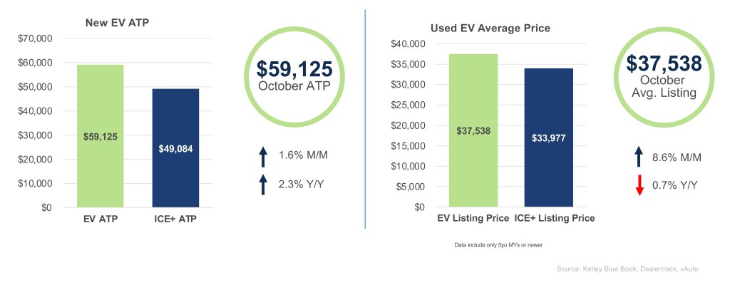 New EV ATP: In October, the average transaction price (ATP) for new electric vehicles climbed to $59,125, up 1.6% from September and 2.3% year over year. The price premium over internal combustion engine (ICE+) vehicles widened to $9,359, while incentives dropped to their lowest level of the year at 11.1% of ATP, or roughly $6,546. Porsche led all brands in month-over-month ATP gains with a dramatic 29.5% increase to $145,761, driven by the Taycan’s 35% jump and the Macan’s 1.3% rise. Higher-volume brands that led price increases included Chevrolet, up 5.4%, and Cadillac, up 5.1%. Tesla’s ATP declined 1.1% to $53,526, as its dominant sales volume continued to anchor the lower end of the EV price spectrum even as the overall market shifted upward.