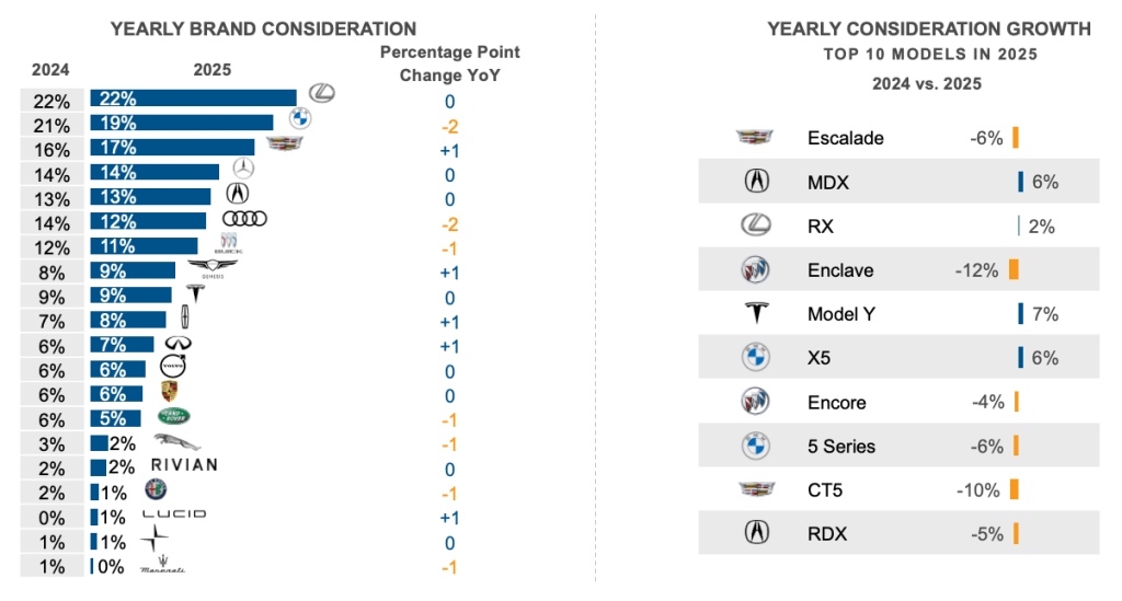 Lexus held the top spot as the most considered luxury brand in 2025, while Cadillac, Genesis, Lincoln, Infiniti and Lucid all posted year-over-year increases. Four models in the Top 10 recorded yearly consideration growth: the Acura MDX, Lexus RX, Tesla Model Y and BMW X5.
