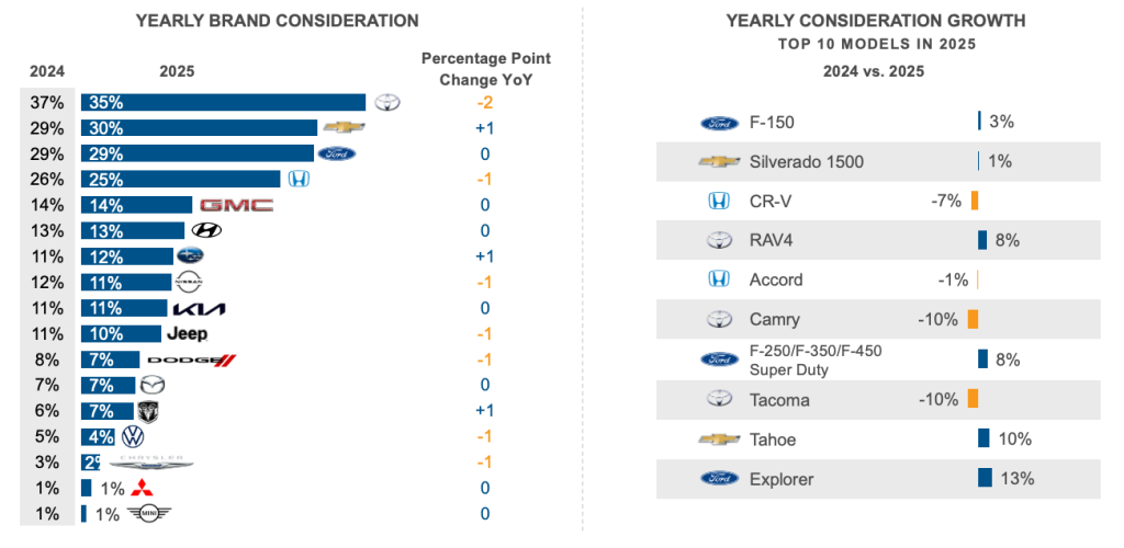 Toyota remained the most considered non-luxury brand in 2025, despite a slight year-over-year dip. Chevrolet, Subaru and RAM all gained momentum during the past year. Pickup trucks again dominated shopper attention, led by the Ford F-150 and Chevrolet Silverado – two of the Top 10 models that posted year-over-year consideration growth. Other models that grew included the Toyota RAV4, Ford F-Series Super Duty models, Chevrolet Tahoe and Ford Explorer.