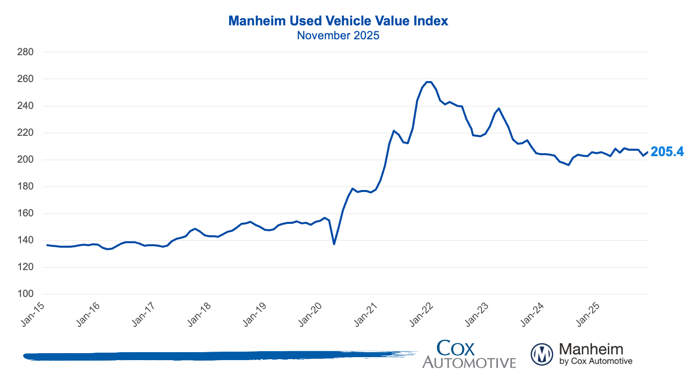 - The Manheim Used Vehicle Value Index (MUVVI) rose to 205.4, reflecting a 1.3% increase in November’s wholesale used-vehicle prices (adjusted for mix, mileage, and seasonality) compared to October. The index is mostly unchanged compared to November 2024. The long-term average monthly move for November is a decrease of 0.6%.