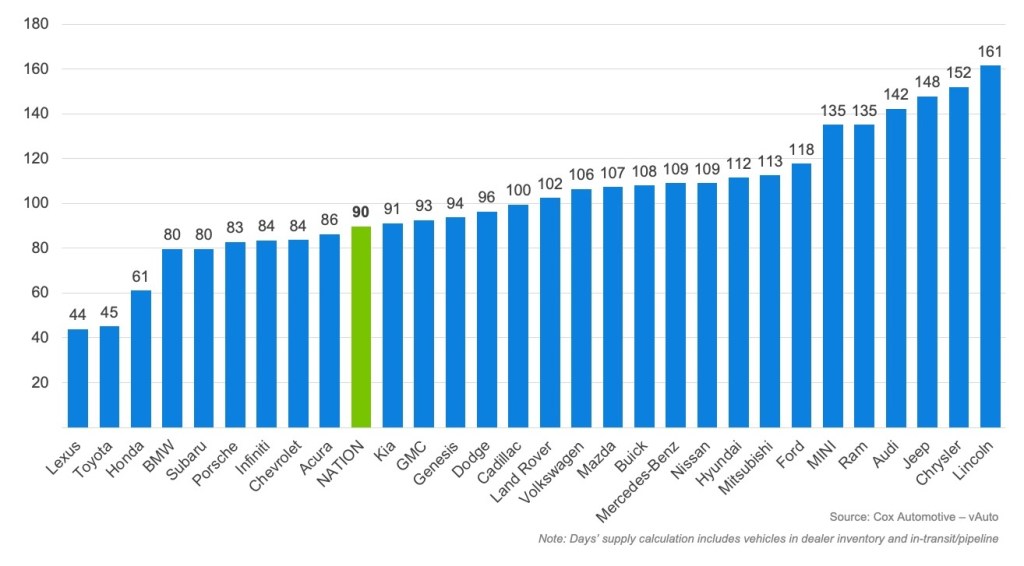 Beneath the national averages, individual brands face starkly different realities. The usual suspects, Toyota and Lexus, move inventory quickly, 45- and 44-days’ supply, respectively. Others, such as the Stellantis brands Chrysler, Jeep and Ram, as well as the luxury brand Audi, lag far behind, with a supply of 130 days or more. Brands with a balanced approach to inventory, including Honda, BMW, Subaru and Chevrolet, highlight the importance of product-market fit.