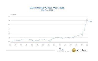 Wholesale used-vehicle prices (on a mix-, mileage-, and seasonally adjusted basis) were essentially unchanged from May after the first 15 days of June. This kept the Manheim Used Vehicle Value Index at 222.7, which was up 11.1% from June 2021. The non-adjusted price change in the first half of June was a decrease of 0.3% …