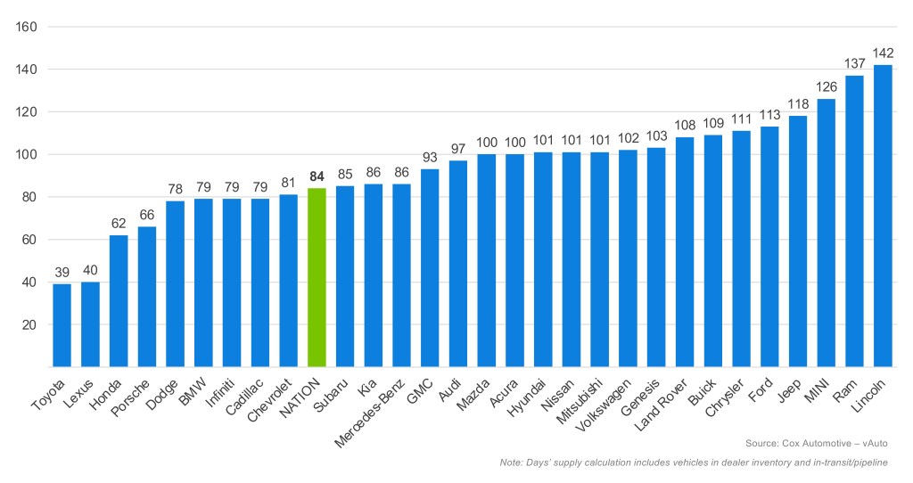 Due to a recent fire at an important supplier, inventory for key Ford and Lincoln products, including the best-selling Ford F-150 pickup and the profitable and popular Expedition and Lincoln Navigator full-size SUVs, could be under pressure in the coming months. At the start of October, Ford’s popular F-150 model had a days’ supply measure of 105, a typical level for a full-size pickup truck. Expedition days’ supply across the two models was close to 80 days, while Lincoln Navigator days’ supply was elevated at 113 across the two models. Ford brand’s days’ supply has been increasing in recent months. At the end of September, Ford’s days’ supply stood at 113, up 12% from the previous month. Lincoln days’ supply at the start of the month was 142, close to the highest level all year.