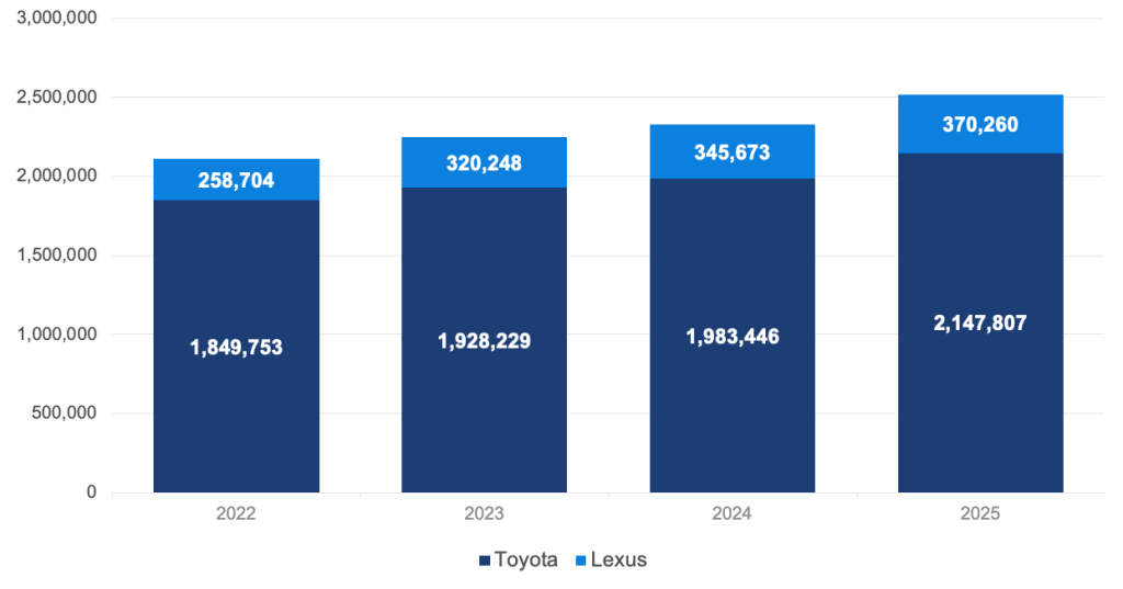Toyota Motor North America reported 2025 U.S. sales of 2,518,071 vehicles, up 8.0% year over year, outpacing the broader market in a year marked by tariff volatility and shifting electric vehicle (EV) incentives. Electrified vehicle sales for the hybrid pioneer reached 1,183,248 units, up 17.6% year over year and representing nearly 50% of Toyota’s total sales. This performance stands out in a year when the industry finished at 16.3 million units, the best result since 2019 but still well below the 17.5 million high-water mark from a decade ago.