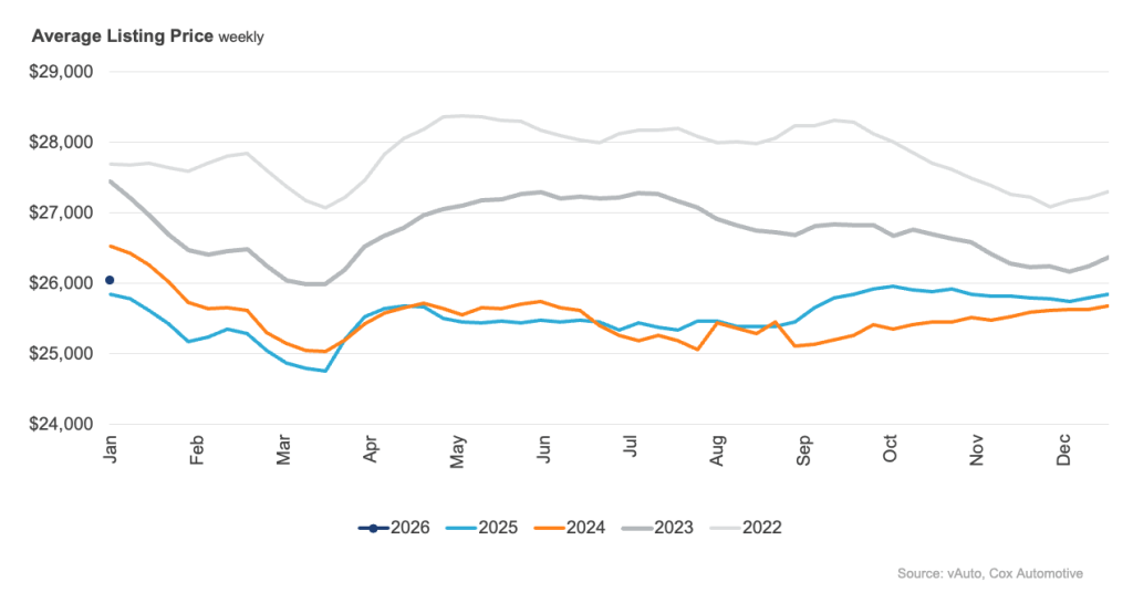 Used-vehicle retail prices increased in the most recent measure. The average used-vehicle listing price was $26,043, up about 1% compared to the levels observed a year earlier and up 1% from the revised $25,792 at the beginning of December.