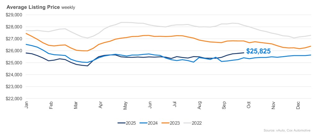 Used-vehicle retail prices increased in the most recent measure. The average used-vehicle listing price increased to $25,825, up from the revised $25,371 at the beginning of September and up 2% compared to the levels observed a year earlier.