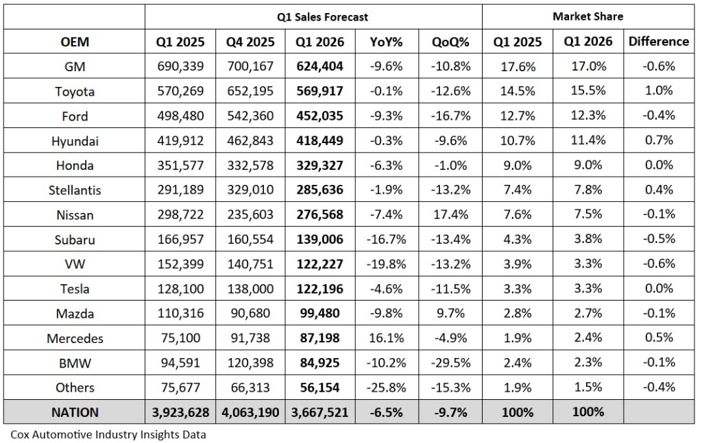 New-vehicle sales volume in March is forecast at 1.37 million units, down 14.2% from the tariff-driven surge seen in March 2025, but higher than February by 14.3%. March is traditionally a strong month for new-vehicle sales and often shows a volume increase from February.