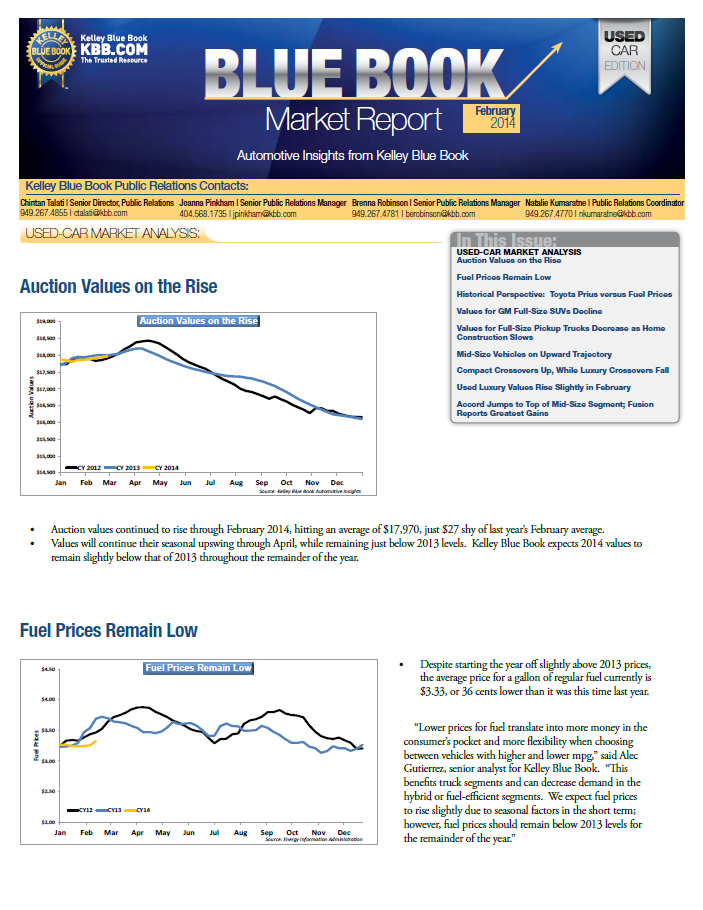 The Kelley Blue Book Used Car Market Report is a monthly publication that explores the state of the automotive industry by analyzing Kelley Blue Book® Auction Values.
