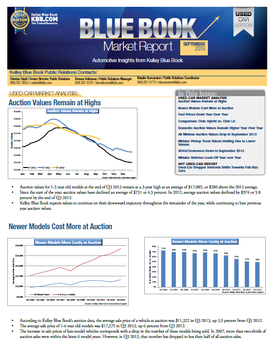 The Kelley Blue Book Used Car Market Report is a monthly publication that explores the state of the automotive industry by analyzing Kelley Blue Book® Auction Values.
