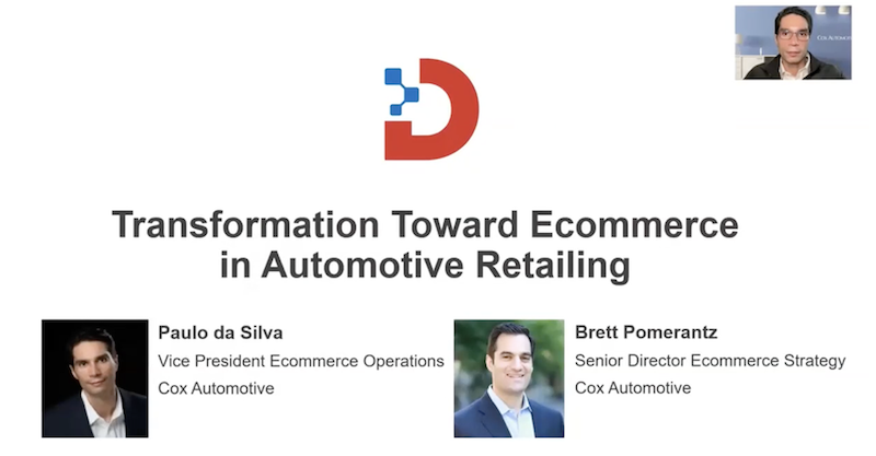 A replay of the Cox Automotive Transformation Toward eCommerce in Automotive Retailing webinar presented by Paulo da Silva, Vice President of Ecommerce Operations and Brett Pomerantz, Senior Director of Ecommerce Strategy is now available. Tune in to hear Paulo and Brett discuss how retailer processes and approaches are evolving to keep up with consumer buying preferences.