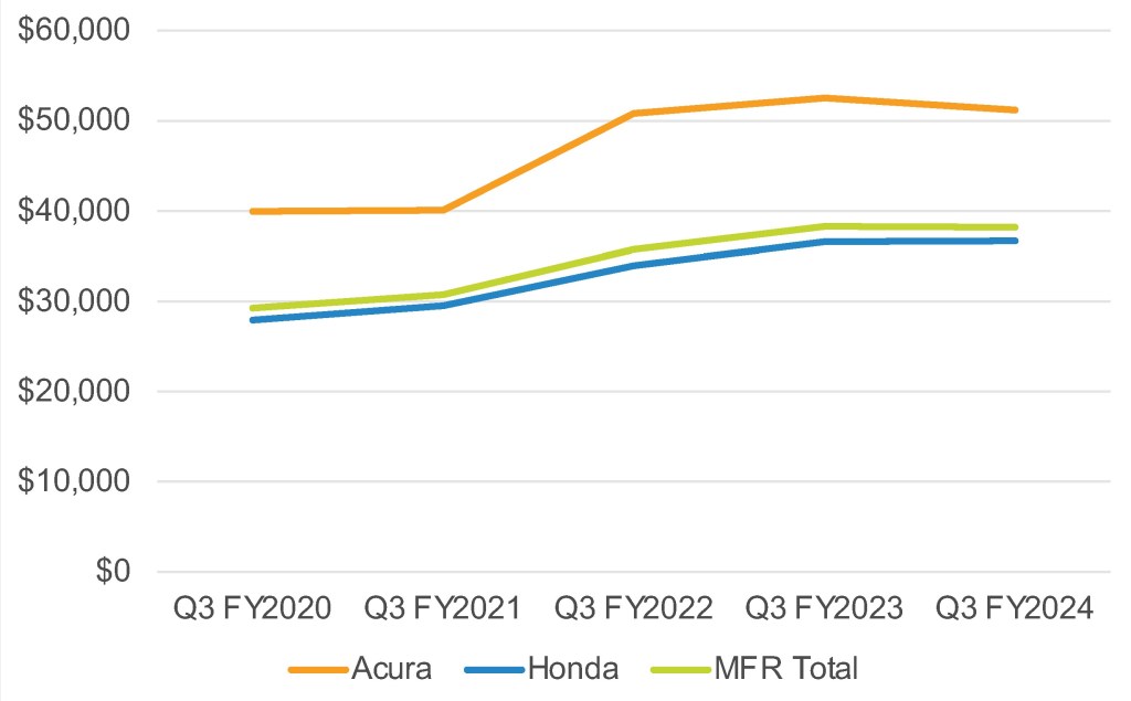 American Honda’s overall average transaction price (ATP) was roughly flat with a year ago at $38,1888, according to Cox Automotive calculations. Still, in the same quarter in 2019, ATPs were below $30,000.