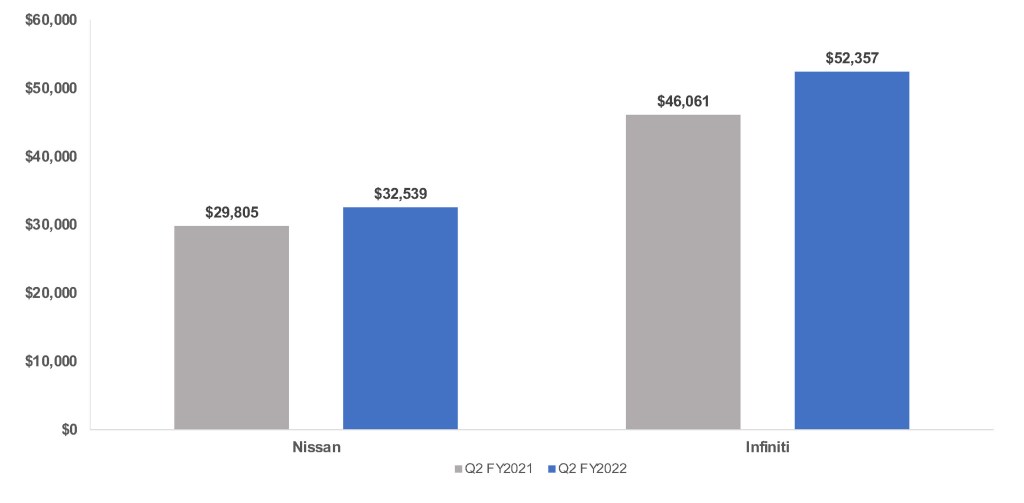 Infiniti’s ATP climbed 14% to $52,357. It was pulled up by the Q50, Q60, QX50 and its highest-priced model, the QX80 at $76,483.