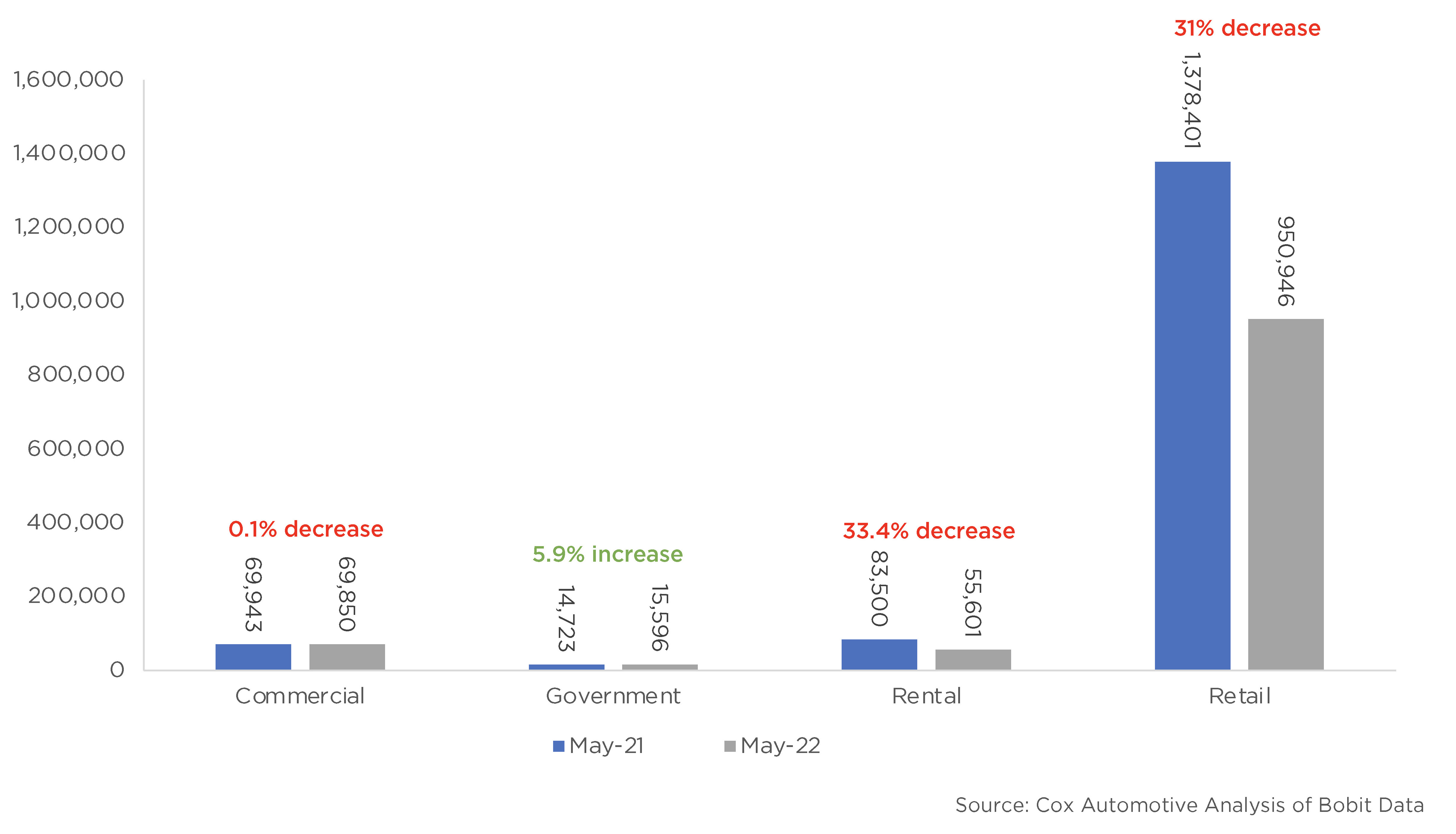 Combined sales into large rental, commercial, and government fleets decreased 16.1% from May 2021. Sales into government fleets were up 5.9% year over year while commercial fleets were down a fraction at 0.1% year over year. Meanwhile, rental fleet volume remains extremely low, down 33% from last May.