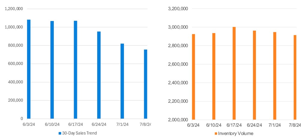 The chart below illustrates the impact of the market disruptions that started in mid-June. Inventory volume maintained a steady level. However, sales noticeably fell off after the mid-month point and continued falling into the start of July. The 30-day new-vehicle sales trend dropped 30% month over month in that timeframe, which can be largely attributed to the outage and indicates why inventory, as measured by days’ supply, is abnormally high at the start of July.