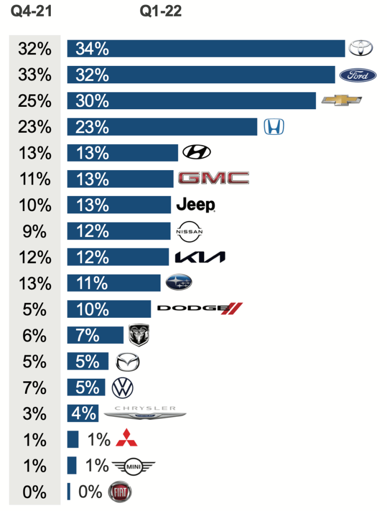 Other gainers were: Jeep, up 3 percentage points due to new products, including the new Grand Cherokee, Wagoneer and Grand Wagoneer; Nissan, up 3 percentage points; and GMC, up 2 percentage points because of the launch of the GMC Hummer EV. Two other Stellantis brands – Chrysler and Ram – were each up a percentage point.