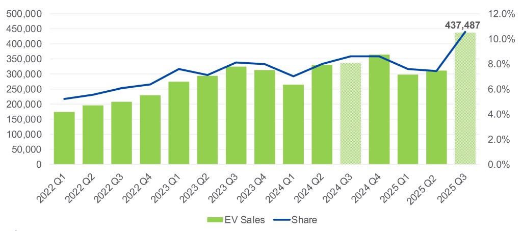 As expected, electric vehicle (EV) sales volume in the U.S. hit an all-time high in Q3 2025: 438,487 units sold, according to Kelley Blue Book estimates. EV sales volume in Q3 was up 40.7% from the previous quarter and higher by 29.6% year over year. The Q3 record beat the prior peak set in Q4 2024 by nearly 20%. During the third quarter, electric vehicles accounted for 10.5% of total vehicle sales, also a new record and a significant increase from the 8.6% share in the same period last year.