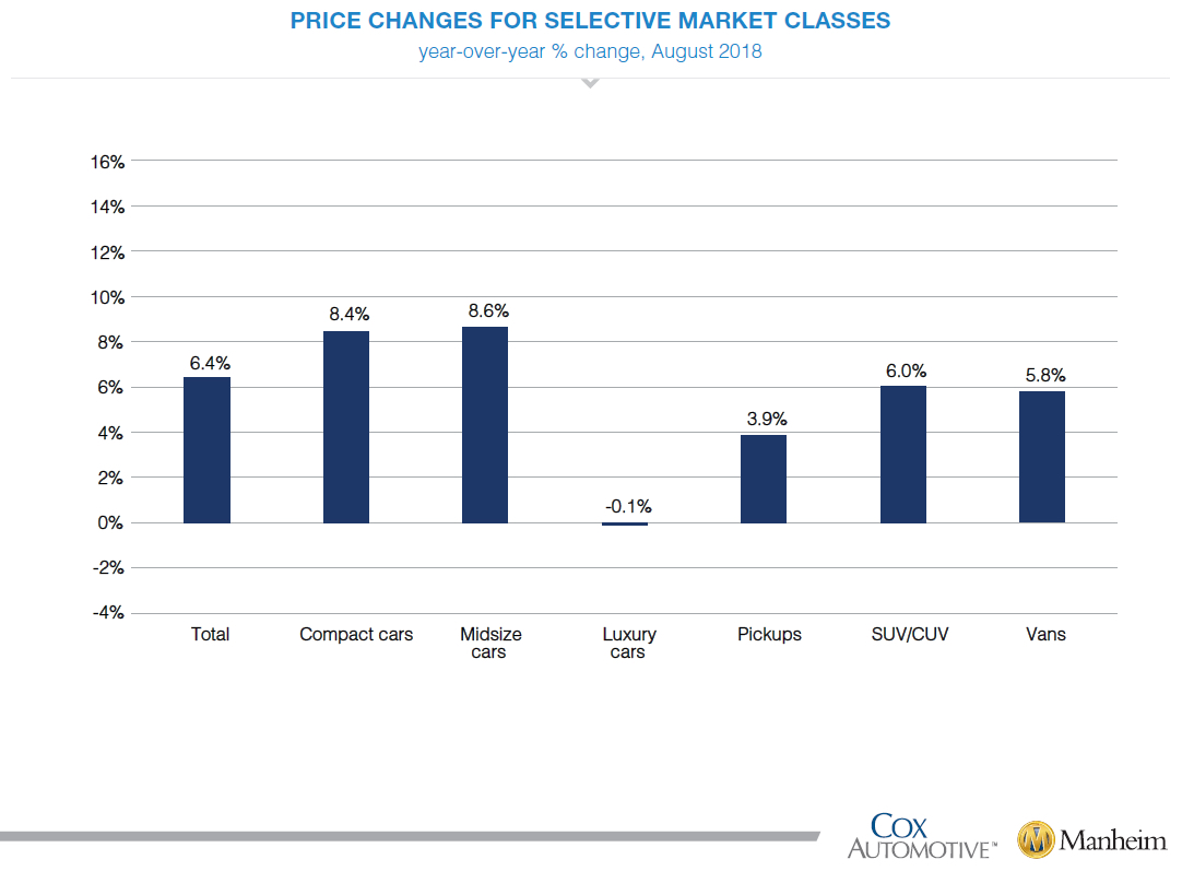 On a year-over-year basis, most major market segments saw price gains in August; but more affordable vehicles are seeing the greatest increases in values. Compact cars and midsize cars outperformed the overall market, while vans, utility vehicles, and pickups underperformed the overall market.